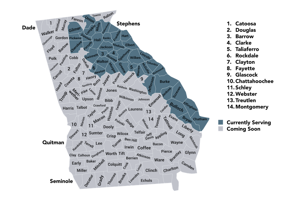 Appling, Atkinson, Bacon, Baker, Ben Hill, Berrien, Brantley, Brooks, Bryan, Bulloch, Burke, Calhoun, Camden, Candler, Carroll, Charlton, Chatham, Chattahoochee, Clay, Clayton, Clinch, Coffee, Colquitt, Columbia, Cook, Coweta, Crisp, Decatur, DeKalb, Dodge, Dooly, Dougherty, Douglas, Early, Echols, Effingham, Emanuel, Evans, Fayette, Fulton, Glascock, Glynn, Grady, Hancock, Haralson, Harris, Heard, Irwin, Jeff Davis, Jefferson, Jenkins, Johnson, Lanier, Lee, Liberty, Long, Lowndes, Marion, McDuffie, McIntosh, Meriwether, Miller, Mitchell, Montgomery, Muscogee, Pierce, Pike, Pulaski, Quitman, Randolph, Richmond, Schley, Screven, Seminole, Stephens, Stewart, Sumter, Talbot, Tattnall, Telfair, Terrell, Thomas, Tift, Toombs, Treutlen, Troup, Turner, Upson, Ware, Warren, Washington, Wayne, Webster, Wheeler, Wilcox, Worth