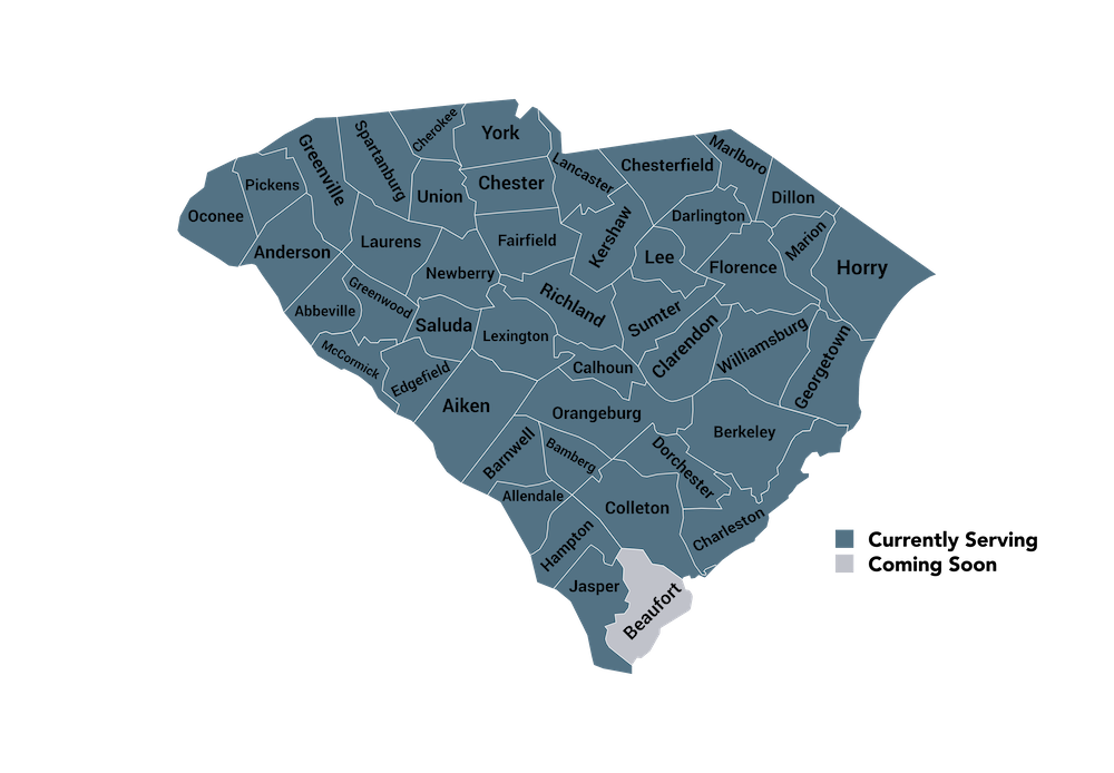 Abbeville, Aiken, Anderson, Bamberg, Barnwell, Berkeley, Calhoun, Charleston, Cherokee, Chester, Clarendon, Colleton, Dorchester, Edgefield, Fairfield, Georgetown, Greenville, Greenwood, Horry, Kershaw, Lancaster, Laurens, Lee, Lexington, McCormick, Newberry, Oconee, Orangeburg, Pickens, Richland, Saluda, Spartanburg, Sumter, Union, Williamsburg, York